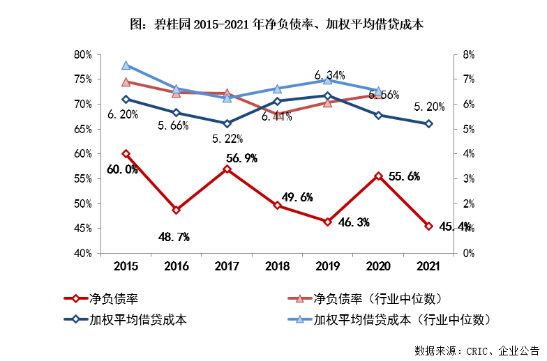 【凈負債率45.4%,融資成本保持行業低位】2021年,碧桂園實現營業收入5230.6億元,同比增長13%。毛利潤927.8億元、凈利潤409.8億元;毛利率17.7%、凈利率7.8%、核心凈利率5.1%,較去年同期均有不同程度的降低。截至2021年末,碧桂園總有息負債下降至3179.2億元,凈負債率45.4%,較2020年末降低10.2個百分點。期末融資成本較去年末降低36個基點至5.2%。