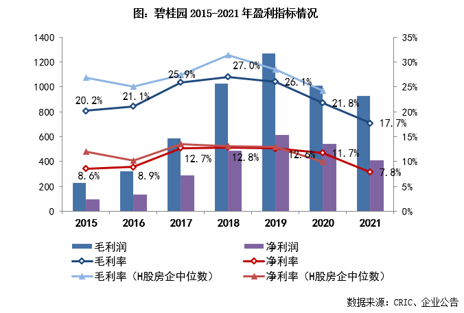 2021年,碧桂園實現營業收入5230.6億元,同比增長13%;毛利潤927.8億元、凈利潤409.8億元;歸母凈利潤268億元、核心凈利潤269.3億元。毛利規模的下降主要是受到2017、2018年部分高成本獲取的低毛利項目進入交付和2021下半年市場下行行業降價促銷影響,對結算利潤率水平有一定影響。2021年,碧桂園實現毛利率17.7%、凈利率7.8%、核心凈利率5.1%,較去年同期均有不同程度的降低。管理層預計,目前短期內還處于市場出清的過程中,中長期毛利率水平有改善空間。