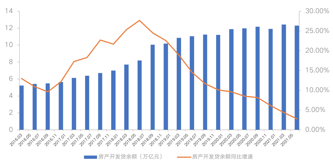 在房地產貸款集中度管理制度的影響下,房企的銀行貸款融資增速持續走低。銀保監會公布的數據顯示,截至7月末,銀行業房地產貸款余額同比增長8.7%,增速創8年新低,低于其他各項貸款增速3個百分點;此外,根據央行公布的數據,2021年二季度末房地產開發貸余額12.3萬億元,同比增速2.8%,增速同樣也是近10年來的新低。