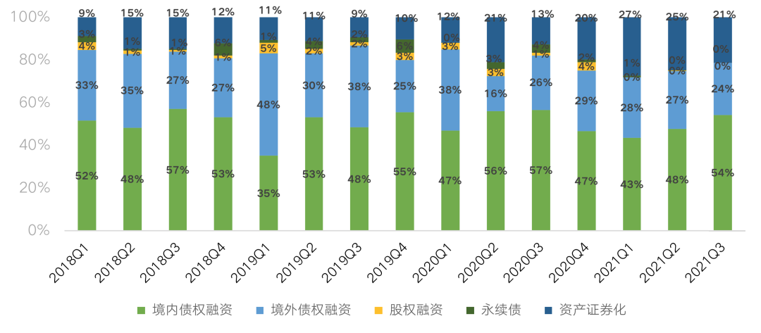 2021年第三季度,房企境內債權融資額為1560.58億元,同比下降41%,環比下降13%;境外債權融資703.28億元,同比下降41%,環比下降31%;在永續債方面,三季度無企業發行永續債;股權融資方面,發行的企業較少,僅有保利置業進行以股代息發行的的1.07億港元再融資;在資產證券化融資方面,供應鏈資產證券化持續扮演房企重要的融資補充手段,三季度融資額為607.45億元,同比上升4%,環比下降35%。