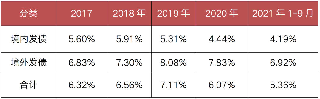 表:2017-2021年9月房企境內外債券融資成本