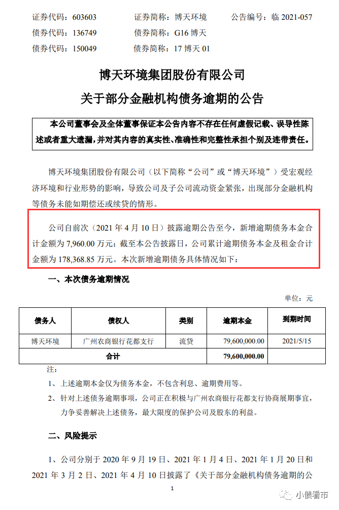 公告顯示,博天環(huán)境新增逾期債務(wù)本金合計(jì)7960萬(wàn)元,截至公告披露日累計(jì)逾期債務(wù)本金及租金合計(jì)金額為17.84億元。