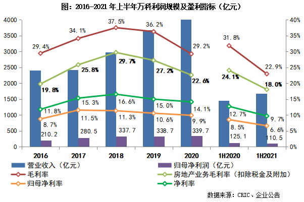 目前行業利潤空間承壓、盈利整體下行壓力加劇,疊加前期高地貨比項目進入結算,上半年萬科結轉項目利潤率走低。2021年上半年,萬科實現毛利率22.9%、扣除稅金及附加之后的房地產業務毛利率18.04%、凈利率9.7%、歸母凈利率6.6%,各盈利指標均回落至歷史低位。