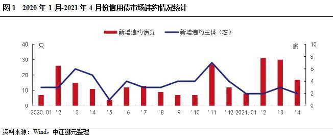 信用風險事件回顧:2021年4月份發生信用風險事件24次,涉及16家發行人。其中,首次違約的主體有2家。具體看首次違約債券特征:4月首次違約債券17只,涉及12家發行人。從違約類型看,首次因觸發交叉保護條款而違約的債券有5只,其他均為實質性違約。從違約事件看,除交叉違約外,12只債券均為本金利息項違約。從債券類型看,中期票據6只,公司債5只,私募債3只,短期融資券2只,定向工具1只。從企業性質看,2家新增違約主體中同濟堂為民營企業,紫光通信為中央國有企業。從上市情況看,本月新增違約主體均為非上市公司。從處置方式看,“18華聞傳媒MTN001”在2020年10月與持有人達成展期兌付協議,此外,華夏幸福、永煤控股和河南能源、鴻達興業繼續通過持有人會議與持有人達成延期兌付協議。