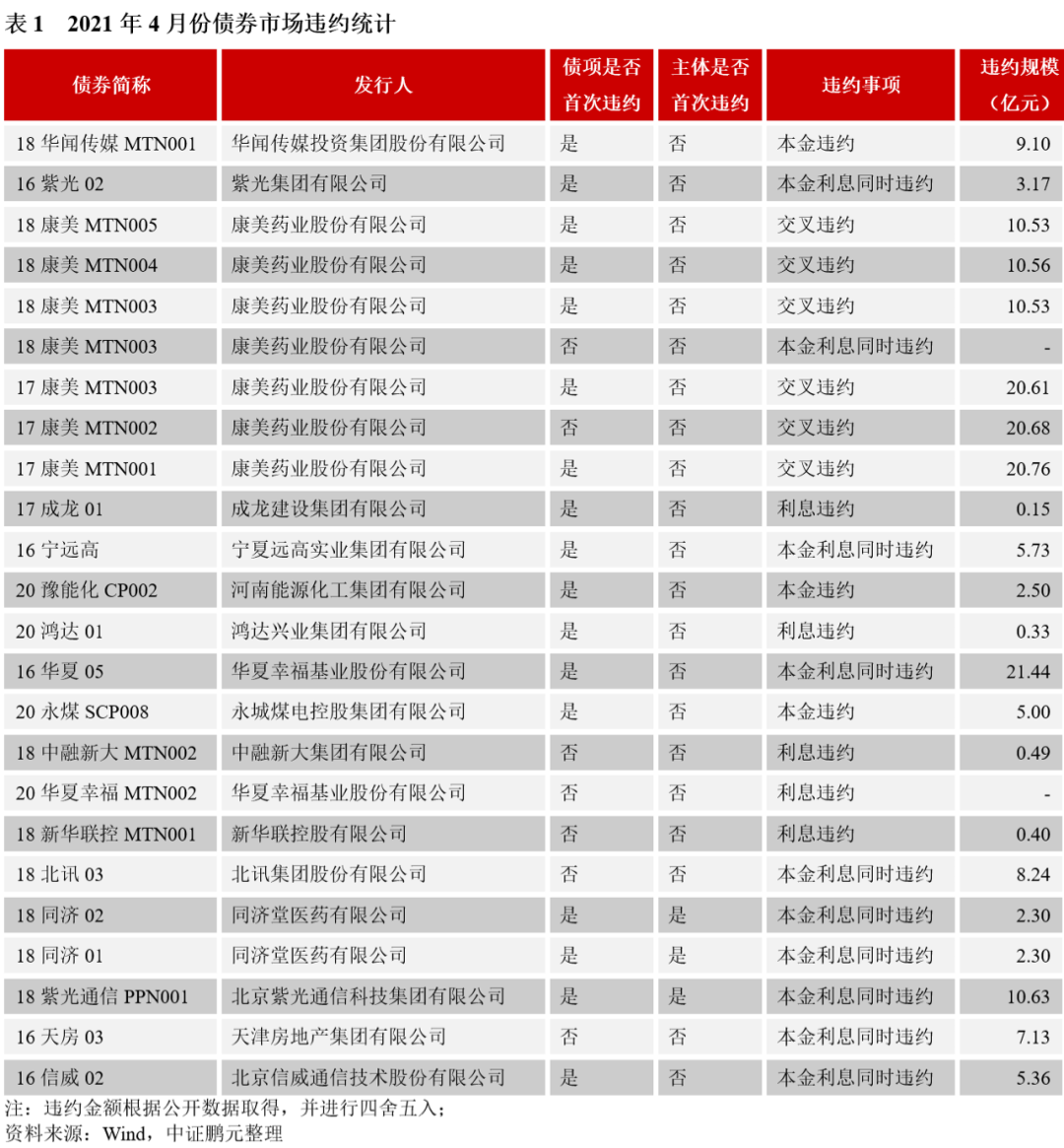 4月首次違約債券17只,涉及12家發行人。從違約類型看,首次因觸發交叉保護條款而違約的債券有5只,其他均為實質性違約。從違約事件看,除交叉違約外,12只債券均為本金利息項違約。從債券類型看,中期票據6只,公司債5只,私募債3只,短期融資券2只,定向工具1只。從企業性質看,2家新增違約主體中同濟堂為民營企業,紫光通信為中央國有企業。從上市情況看,本月新增違約主體均為非上市公司。從處置方式看,“18華聞傳媒MTN001”在2020年10月與持有人達成展期兌付協議,此外,華夏幸福、永煤控股和河南能源、鴻達興業繼續通過持有人會議與持有人達成延期兌付協議。