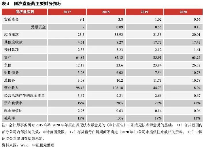 第一,擴張激進,并購失敗。同濟堂醫藥在2018年并購了龍海新藥(河北民營醫藥流通企業前列)及廣東坤和兩家公司,后因管理分歧,2019年公司將溢價收購的龍海新移出合并報表,轉讓相應55%的股權,使得當年商譽減少99.69%。第二,應收款項占用資金嚴重。行業應收預付款規模較高,尤其是中小區域性醫藥物流企業,在行業競爭加大的情況下,會給予下游公司較寬的信用政策,企業預付供應商貸款上升,從而使得資金壓力上升,后期回收風險較高。同濟堂醫藥的應收款項規模占比高,形成嚴重的資金占用。2019年末,同濟堂控股通過供應商及其他非關聯方等方式占用同濟堂醫藥資金 10.47 億元,令其他應收款大幅增加,同濟堂控股承諾將在2020-2022 年期間以現金方式分批償還全部占用資金本金及利息。第三,償債可用資金大幅下降。2018年公司對客戶采取寬信用政策導致應收款項、預付及采購和醫院保證金支出增加,導致經營活動凈現金流由正轉負。2019年(即業績對賭期3年完成后)公司更新代理/渠道業務模式,不再承擔向客戶轉讓商品的主要風險,按凈額法確認收入[3],上述業務模式和收入確認方式的變化令其醫藥批發收入同比大幅下降。此外,非受限資金規模逐年遞減。