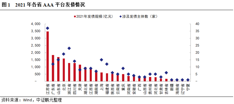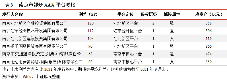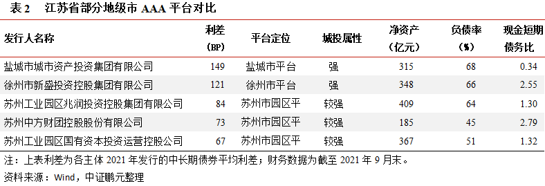 對于經濟發達省份,市場偏好的AAA平臺所在區域的行政層級已下沉至區縣甚至市級園區。如江蘇省作為發債大省,2021年共有37家AAA發債主體,主體數量遙遙領先其他省份,江蘇AAA平臺大量下沉至區縣平臺甚至部分經濟強市的市級園區平臺。37個平臺除省級平臺外,還包括南京市的8個市級平臺及其下轄的江寧開發區、江北新區等5個區級平臺,經濟強市蘇州、無錫、常州、南通的主要平臺和蘇州市下屬的3個工業園區平臺,以及鹽城、徐州、揚州的核心平臺,昆山、張家港2個經濟強縣的核心平臺。整體上,江蘇省AAA平臺的城投屬性較強,凈資產規模相對高等級主體處于一般水平(除兩家凈資產上億的平臺外,其他35家平臺平均凈資產規模350億元、中位數315億元),平均發行利差101BP,表現較好。