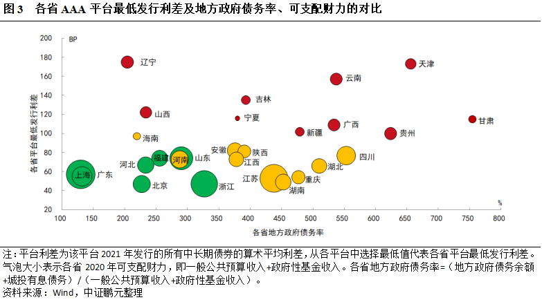 同樣由于平臺差異性因素,部分省市的區域加權平均利差則較為接近平臺最低利差。如貴州,與其他西部經濟弱省相比,其區域加權平均利差表現較好,系主要受益于2021年AAA平臺發債集中在低利差主體“貴州高速公路集團有限公司”,該平臺為省內優質主體且疊加茅臺資本加持后備受市場青睞、發行利差低至100BP。