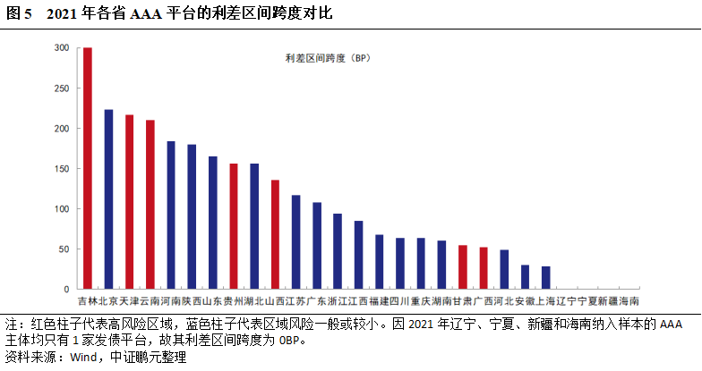 各省AAA平臺的利差區間跨度不一,省內不同平臺的市場認可度分化較大,其中高風險區域僅個別核心平臺利差較低,大部分平臺的利差高;而低風險區域,除少數平臺利差較高外,大部分平臺利差較低