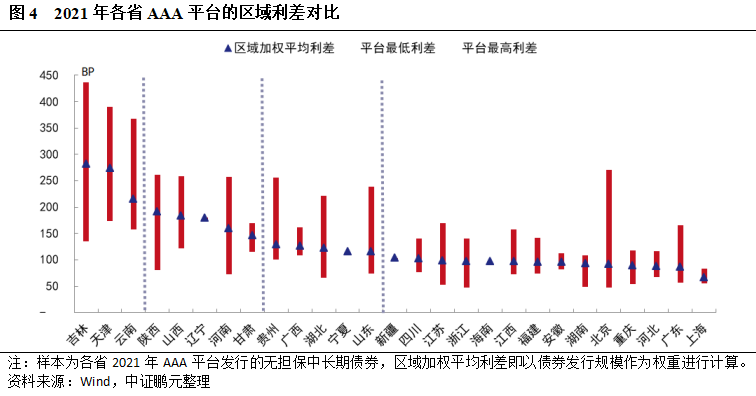 (2)各省AAA平臺間的利差跨度不一,同區域不同平臺的市場認可度存在較大差異性。同區域內不同AAA平臺的最高發行利差和最低發行利差的區間跨度對比,吉林、天津、云南、貴州等區域融資環境不佳,平臺間的利差跨度大,除個別平臺利差較低外,大部分平臺市場認可度不高、利差很大;而湖北、江蘇、廣東、浙江、江西等區域融資環境較好,平臺利差區間跨度亦較大,但主要表現在少數平臺城投屬性弱、利差較高,多數平臺利差仍較低。