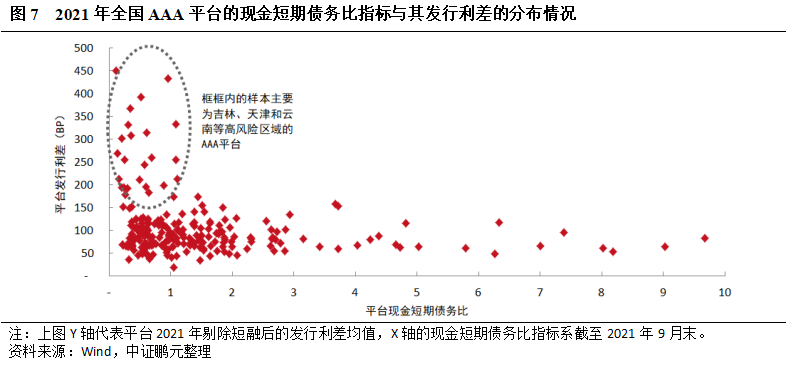 在吉林、天津、云南等高風險區域的AAA平臺普遍表現出“現金短期債務指標低、發行利差高”特征