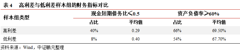 此外,我們通過高利差組(利差最大的前50個樣本)和低利差組(利差小的后50個主體)的核心財務指標進行對比,亦發現兩個樣本組在資產負債率方面的差異性并不顯著,但在現金短期債務指標上有一定差異,即高利差組中低現金短期債務比的樣本明顯多于低利差組。高利差樣本組中占比40%的樣本現金短期債務比低于0.5,平均值僅為0.29;而低利差組僅8%的樣本現金短期債務比低于0.5,且平均值達0.40,未來高風險區域的AAA平臺,其短期償債債能力指標值得關注。