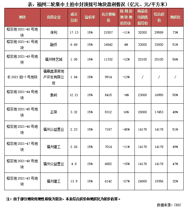 而就盈利情況來看,整體較為可觀。按照綜合指標銷售價來看,除本次土拍最熱門的地塊晉安區(qū)紅光村及周邊地塊(榕宗地2021-40號地塊)外,其余9宗封頂成交地塊地房比均在60%以下,尤其是福州建工競得的三江口地塊,地房比僅有32%,房地差過萬元,盈利空間均十分可觀。