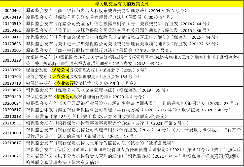 (一)2021年6月21日,銀保監(jiān)會發(fā)布《銀行保險機(jī)構(gòu)關(guān)聯(lián)交易管理辦法(征求意見稿)》并非孤立文件,和之前的系列文件隸屬于同一體系。