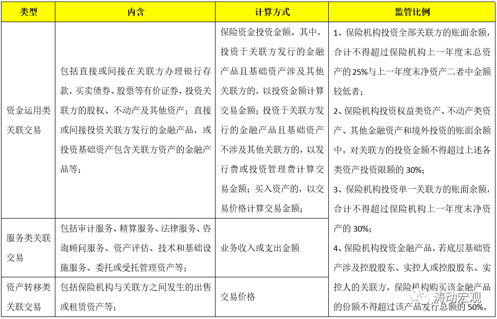 保險機(jī)構(gòu)的關(guān)聯(lián)交易同樣有三類,同時文件明確保險機(jī)構(gòu)與其控股子公司之間,以及控股子公司之間發(fā)生的關(guān)聯(lián)交易不適用下表的約束。此外,文件亦明確保險機(jī)構(gòu)與非金融控股子公司對關(guān)聯(lián)方的投資余額應(yīng)合并計算。