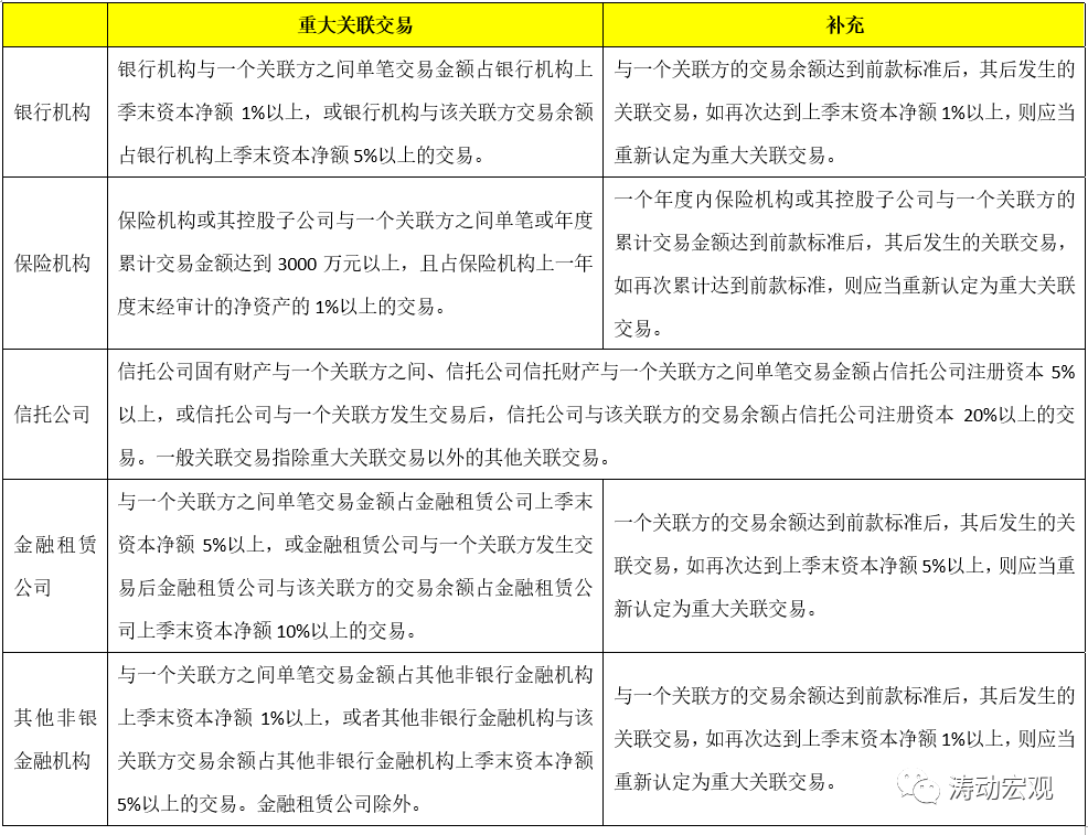 銀行機(jī)構(gòu)的關(guān)聯(lián)交易主要有三類,內(nèi)容上則更為豐富和細(xì)化,如咨詢服務(wù)(主要指投行類)、信息服務(wù)等也被納入。同時文件亦明確銀行機(jī)構(gòu)與境內(nèi)外銀行關(guān)聯(lián)方之間開展的同業(yè)業(yè)務(wù)可不適用相關(guān)比例規(guī)定和重大關(guān)聯(lián)交易標(biāo)準(zhǔn)。