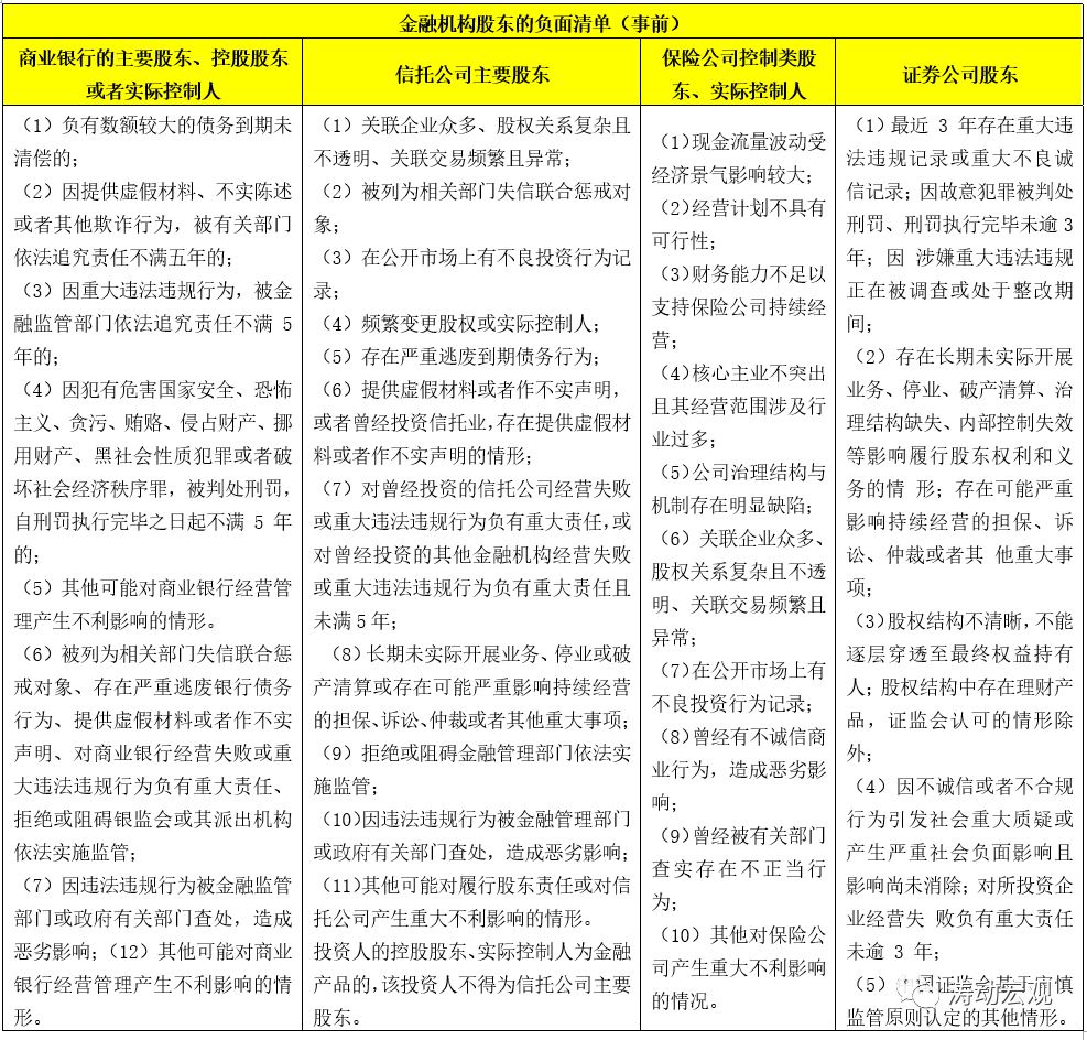 《商業(yè)銀行法(建議修改稿)》以及各類金融股權(quán)管理辦法均列示了對應(yīng)金融機(jī)構(gòu)股東的負(fù)面清單,這兩年有一個最明顯的變化是對透明度和可穿透提出了新要求,如信托公司的主要股東、保險公司控制類股東及實際控制人應(yīng)沒有“關(guān)聯(lián)企業(yè)眾多、股權(quán)關(guān)系復(fù)雜且不透明、關(guān)聯(lián)交易頻繁且異?!?,證券公司股東還應(yīng)規(guī)避“股權(quán)結(jié)構(gòu)不清晰,不能逐層穿透至最終權(quán)益持有人”等情形。