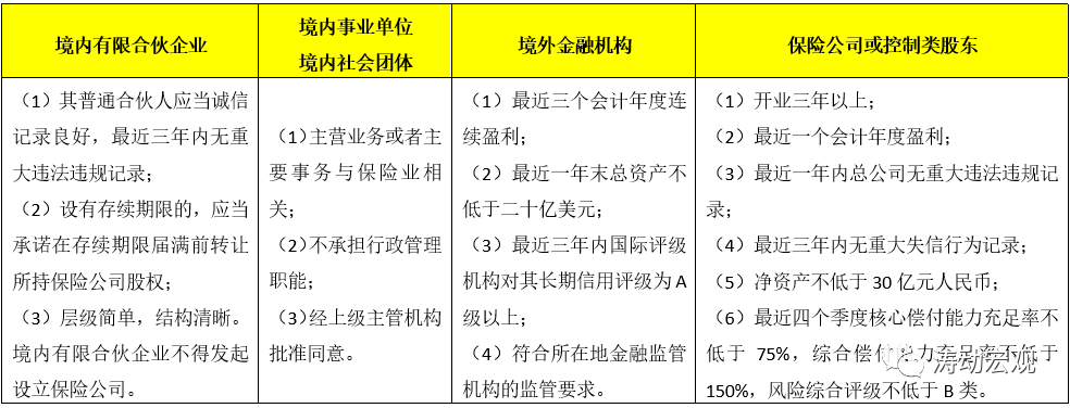 (3)針對保險公司股東為境內(nèi)有限合伙企業(yè)、境內(nèi)事業(yè)單位和社會團(tuán)體、境外金融機(jī)構(gòu)以及保險公司的,還有一些特別規(guī)定,具體如表: