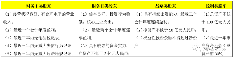 (2)監(jiān)管部門對保險公司的財務(wù)I類股東、財務(wù)II類股東、戰(zhàn)略類股東以及控制類股東條件也進(jìn)行了設(shè)定,即股東門檻依次提高。