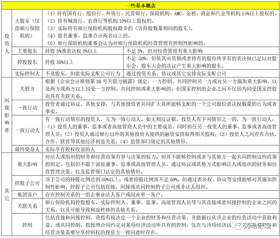 首先需要明確金融機(jī)構(gòu)股東的相關(guān)當(dāng)事人等基本概念,具體如主要股東、控股股東、實際控制人、一致行動(人)、最終受益人和重大影響等。這些概念大都源自《中華人民共和國公司法》和《企業(yè)會計準(zhǔn)則第36號關(guān)聯(lián)方披露》。