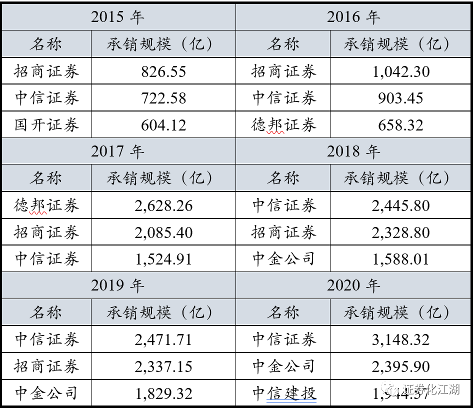 2015-2020年承銷排名前三券商