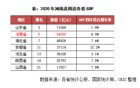 隨著近幾年中原城市群建設(shè)的逐步推進(jìn),河南省城市規(guī)模持續(xù)擴(kuò)大,河南的整體經(jīng)濟(jì)水平穩(wěn)步增長(zhǎng),2020年河南省的GDP水平為54259億元,排名全國(guó)第5,排名在周邊6省中位居第二,且四年GDP復(fù)合增速達(dá)到8.0%,在周邊地區(qū)中僅次于安徽省的12.2%,綜合河南省在全國(guó)的GDP排名較為靠前這一因素來(lái)看,其四年GDP復(fù)合增速在周邊地區(qū)屬于較高水平。