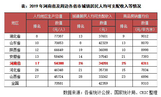 從人均發(fā)展水平來(lái)看,2019年河南省人均地區(qū)生產(chǎn)水平56388元/人,全國(guó)地區(qū)排名第17,城鎮(zhèn)居民人均可支配收入34201元,排名第26名,在周邊接壤的省份中,人均購(gòu)買(mǎi)力屬于下游的地位,整體人均購(gòu)買(mǎi)力較弱。