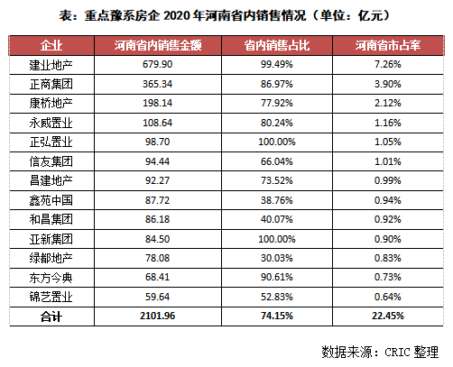 2、豫系房企本省銷(xiāo)售占比超過(guò)7成,主要集中在大鄭州