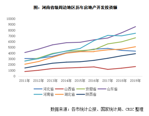從房地產(chǎn)發(fā)展體量上來(lái)看,河南省2019年房地產(chǎn)開(kāi)發(fā)投資額7465億元,全國(guó)各地區(qū)排名第五,房地產(chǎn)市場(chǎng)整體體量較大,同時(shí)同周邊6個(gè)接壤的省份比較來(lái)看,河南僅次于山東省,在中部地區(qū)中屬于領(lǐng)先地位。反映到最終的商品房銷(xiāo)售額來(lái)看,2019年河南省的商品房銷(xiāo)售額9010億元,全國(guó)各地區(qū)排名第六,與周邊接壤的省份相比,僅次于山東省。