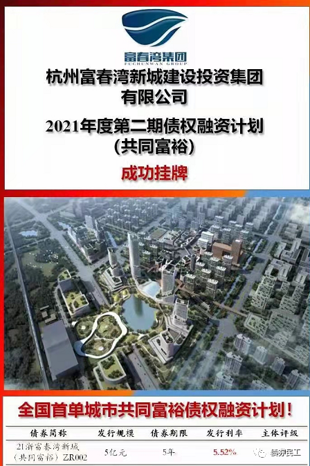 根據(jù)發(fā)行海報,杭州富春灣新城建設(shè)投資集團有限公司(以下簡稱“富春灣建投”)于2021年12月10日成功發(fā)行了2021年度第二期債權(quán)融資計劃(共同富裕)。本期債權(quán)融資計劃發(fā)行規(guī)模為5億元,發(fā)行期限為5年,為全國首單城市共同富裕債權(quán)融資計劃。