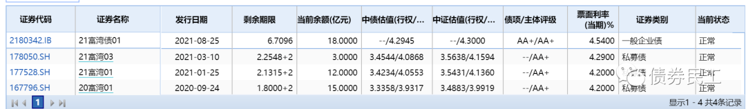 目前,富春灣建投存續(xù)債券金額為48億元,存續(xù)債券4只,存續(xù)債券產(chǎn)品包括企業(yè)債券和私募公司債券。(wind統(tǒng)計口徑中,債權(quán)融資計劃未被列為債券品種)
