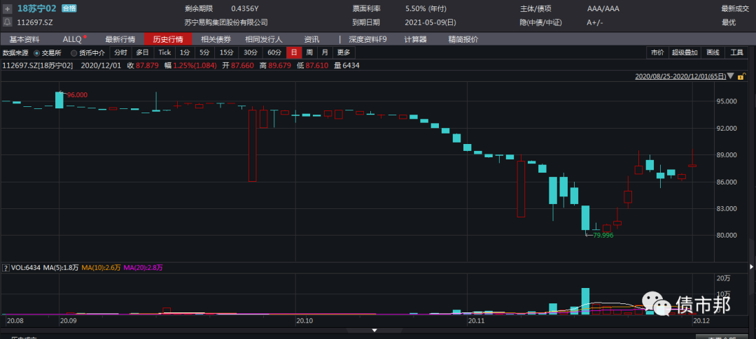 相關債券的回購價格,是11月12號大跌之后的收盤價+應計利息來確定的。以18蘇寧01為例,回購凈價僅為87.29元,也就是說,發行人借了100元的本金,現在只用還87.29元了。