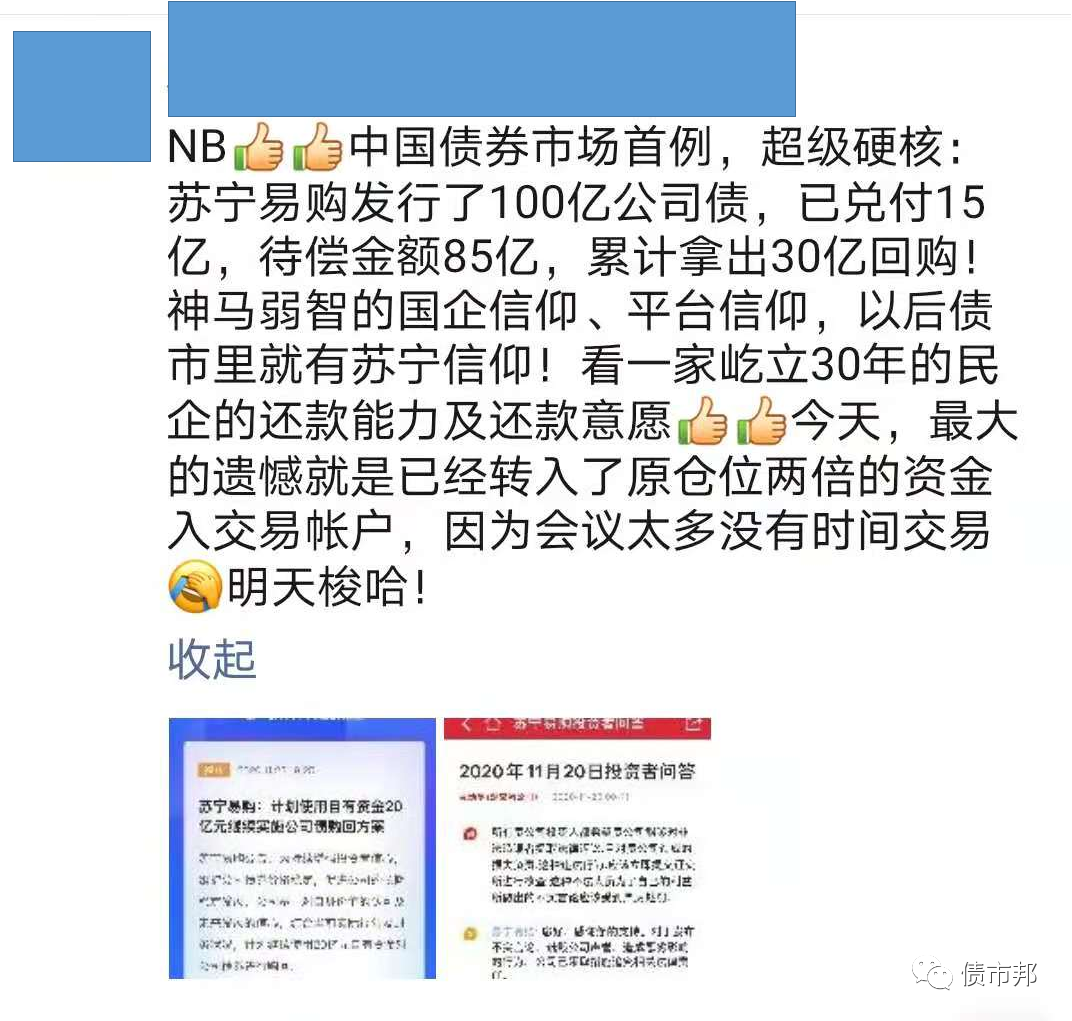 該舉措迅速博得了債券圈的一片掌聲,被譽為有擔當有作為的優秀發行人,可謂是賺足了市場的眼球。蘇寧相關同事甚至在朋友圈喊出了“神馬弱智的國企信仰、平臺信仰,以后債市里就有蘇寧信仰”的口號。頗有老王當年“神馬清華北大,不如膽子大”的神評論風采。