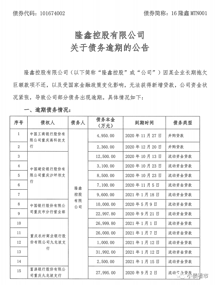公告顯示,隆鑫控股逾期債務多達32筆,涉及工行、中行等十余家金融機構,債務多數已于去年到期。
