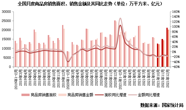 2021年,城市住房需求尤其是改善型住房需求穩(wěn)步釋放,房地產(chǎn)業(yè)增加值比上年增長5.2%,拉動整體經(jīng)濟(jì)增長0.4個百分點。但下半年新開工、土地購置和開發(fā)投資均降至冰點,“以價換量”和信貸寬松給予了年末市場一定“數(shù)據(jù)繁榮”。但本輪信貸、融資、土地等各方面調(diào)控暴露出一大部分城市已存在較大購買力透支問題,短期行業(yè)仍將面臨繼續(xù)下行壓力,各地區(qū)銷售分化和降價效用邊際遞減將繼續(xù)保持,預(yù)計商品房銷售規(guī)模在今年一季度仍將下調(diào)筑底過程中。