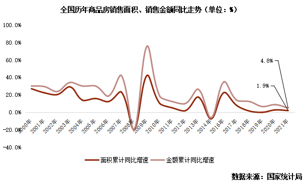據(jù)國家統(tǒng)計局?jǐn)?shù)據(jù):2021年,商品房銷售面積17.9億平方米,比上年增長1.9%;商品房銷售額18.2萬億元,增長4.8%。2021年上半年和下半年商品房銷售面積分別同比增28%和降15%。可見上半年較好的市場表現(xiàn)是全年創(chuàng)新高的主要支撐。