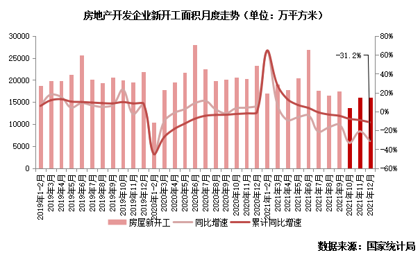 12月全國房屋新開工水平與11月持平,為16075萬平方米。但同比降幅擴(kuò)大至31%,較11月擴(kuò)大了10pcts。傳統(tǒng)的“年底開工潮”不再出現(xiàn),進(jìn)一步表明了民營開發(fā)企業(yè)當(dāng)前仍處于較深困境,銷售回款和融資借款雙雙艱難下,新開工計劃普遍一再取消拖延。