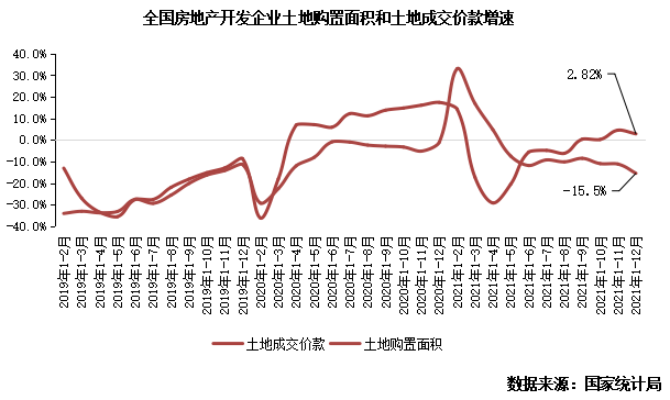 據(jù)國家統(tǒng)計局?jǐn)?shù)據(jù):2021年,房地產(chǎn)開發(fā)企業(yè)土地購置面積2.2億平方米,比上年下降15.5%;土地成交價款1.8萬億元,增長2.8%。單月土地購置面積和成交價款分別為3303萬平方米和3237億元,同比分別下降33%和4%。土地市場已經(jīng)進(jìn)入到了冰點。房地產(chǎn)資金面收到嚴(yán)控下,民營開發(fā)企業(yè)多已無力購置土地,受此影響下土拓投資已難再支撐整體行業(yè)投資規(guī)模。