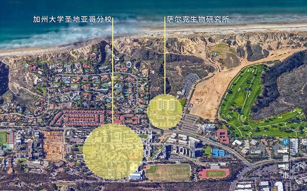 ▼ 薩爾克生物研究所和加州大學圣地亞哥分校的區位關系示意