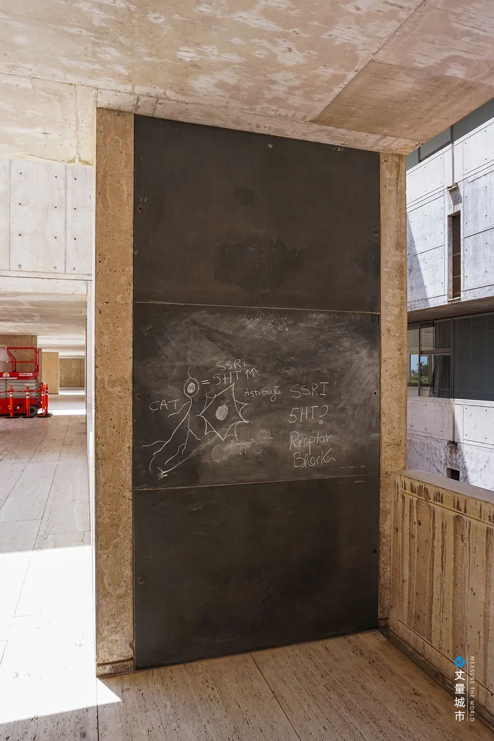 當初設計的用意就是希望能夠促進合作的氣氛。在長廊中,科學家們可以隨時停留下來進行「不經意間的交流」——在墻上寫寫畫畫,留下思考的線索和問題。