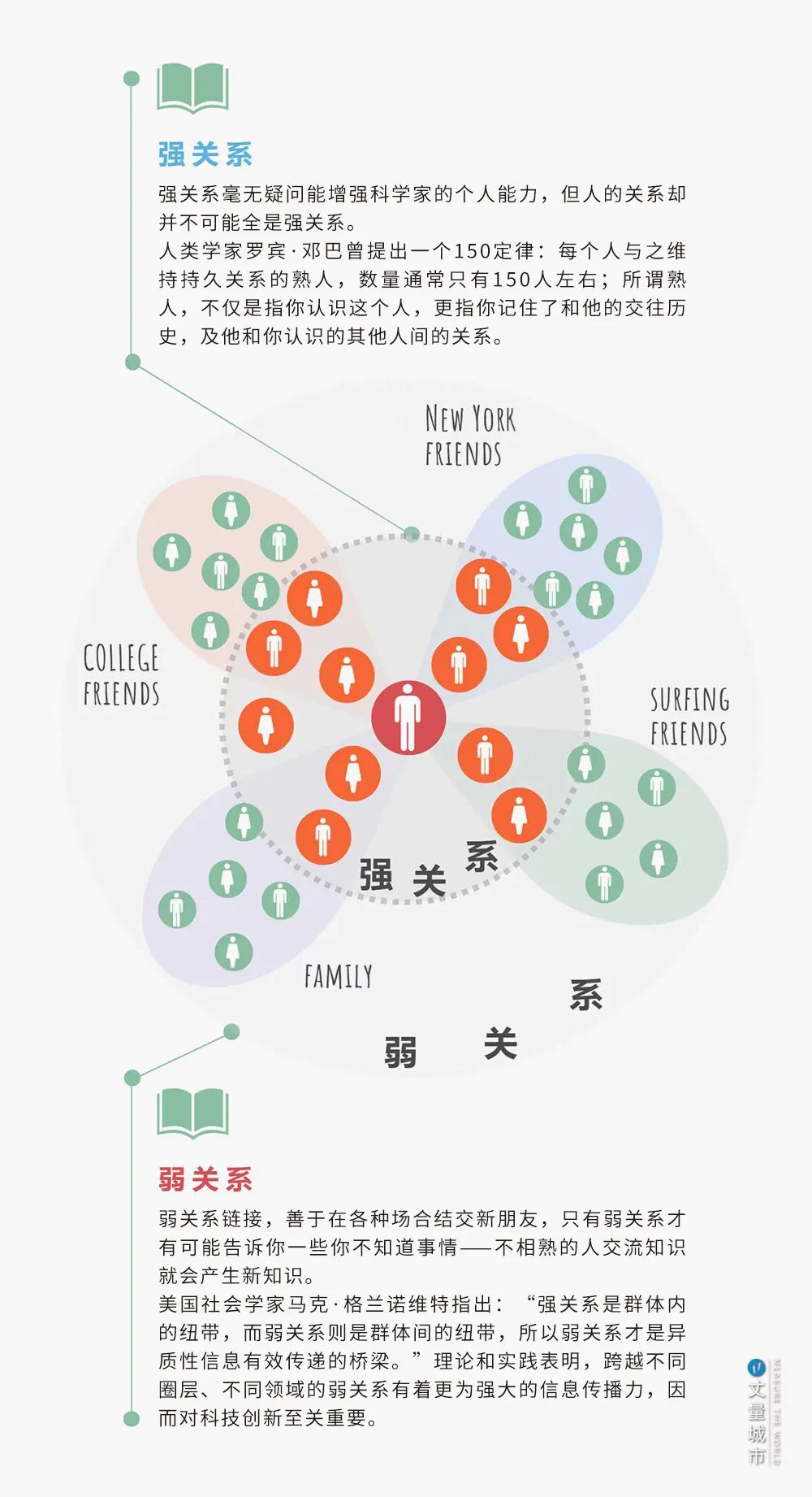 而更重要的是,在城市中心可以見到更多、更多元的人——這對于科學家的「跨界交流」實在太重要了。可以說,城市中心具有構成「跨界交流」的先天優勢——容易形成「弱關系」網絡。那么什么是「弱關系」?