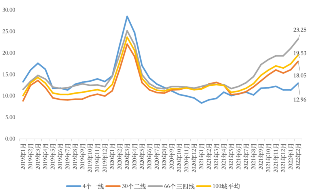 三四線城市形勢更為嚴(yán)峻,去化周期高達23.25個月,已經(jīng)逐步迫近2020年疫情期間水平,環(huán)比上月大幅上漲10%。