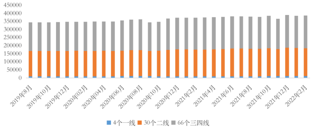 綜合來看,分化趨勢依舊:一線韌性較強,2月狹義庫存整體持穩(wěn),去化周期僅12.96個月,庫存風(fēng)險基本可控;二線“中規(guī)中矩”,狹義庫存波動不大;去化周期雖然同環(huán)比齊增,但仍低于百城平均。三四線壓力陡增,狹義庫存、去化周期同比漲幅屬不同能級之首,顯著超百城平均,此外百城廣義庫存一半以上積壓在三四線城市,基數(shù)較大,短期內(nèi)潛在庫存風(fēng)險依舊較大。