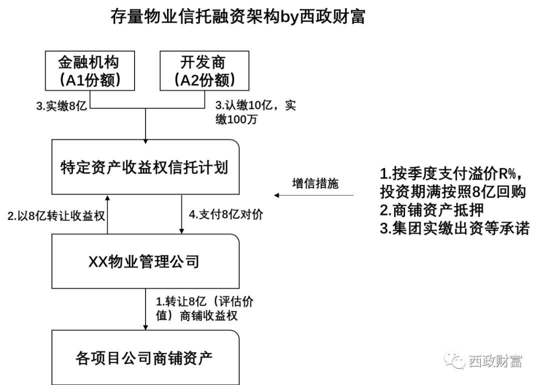 1. 金融機構與開發商分別作為特定資產收益權信托計劃的優先與劣后級,其中金融機構實繳8億元,開發商認繳10億元。信托計劃項下的信托財產投資于物業管理公司的特定資產收益權。