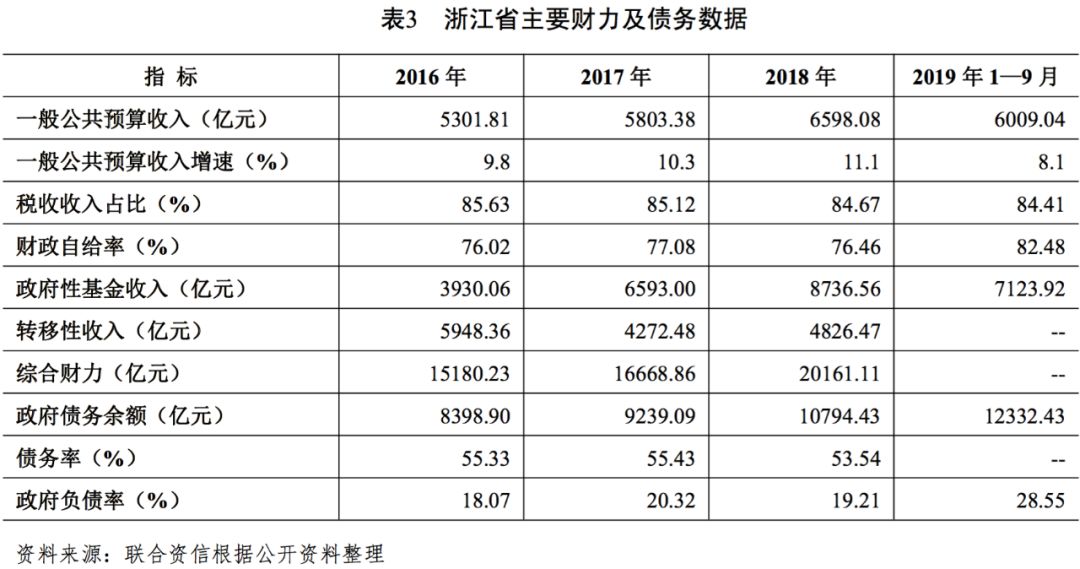 截至2019年9月底,浙江省政府債務余額12332.43億元,其中一般債務余額6210.74億元,專項債務余額6121.69億元,當年新增發債額度已全部用完;期末浙江省政府負債率為28.55%,較上年底增長較快但仍處于較低水平。
