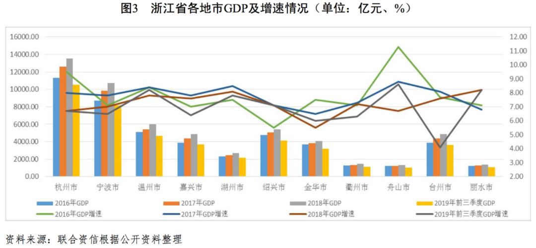 GDP方面,杭州市作為浙江省會城市長期處于領先地位,2017年和2018年,杭州市GDP分別為12603.36億元和13509.15億元,約占同期全省經濟總量的25.00%;寧波市GDP規模長期排名全省第二,并于2018年首次突破10000億元,達到10745.46億元,約占同期全省經濟總量的19.00%;2018年衢州市、舟山市和麗水市GDP均未超過1500億元,其余各地市除湖州市GDP相對較低(2719.07億元)外,其余地市的GDP均超過4000億元。從GDP增速看,杭州市、寧波市受區域經濟總量規模較大影響,近年GDP增速有所下滑,2018年分別為6.70%和7.00%;同期麗水市和湖州市GDP增速居全省前兩位,分別為8.20%和8.10%;剩余各地市GDP增速均位于6.70%―7.80%區間,2018年浙江省各地市的GDP增速均高于同期全國GDP增長水平(6.60%)。2019年1―9月,杭州市GDP持續較快增長,累計完成10511.36億元,同比增長6.70%;臺州市受中美貿易摩擦及臺風“利奇馬”影響,GDP增速大幅降至4.10%,同期實現GDP3629.49億元;剩余各地市GDP均較穩健發展,增速同比變化不大。