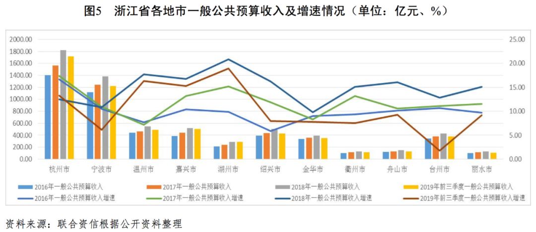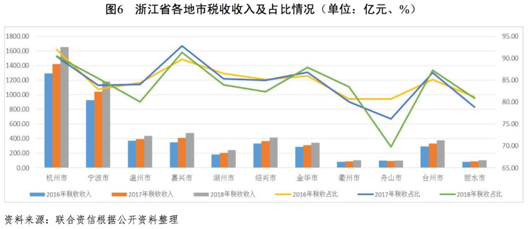 從一般公共預算收入看,杭州市和寧波市長期領跑全省,2018年分別達到1825.10億元和1379.70億元,同期溫州市、嘉興市和紹興市的一般公共預算收入均超過500億元,位居全省第二梯隊,衢州市、舟山市和麗水市受區域經濟發展較弱影響,其一般公共預算收入均在135億元左右,其他各地市的一般公共預算收入處于280―440億元區間。從一般公共預算收入增速方面看,2018年除金華市的增速(9.80%)較低外,其余各地市的增速均超過10.00%;2018年湖州市一般公共預算收入增速達到20.90%(全省第一),其中稅收收入同比增長19.00%。從一般公共預算收入構成看,各地市一般公共預算收入中稅收收入的占比較高,2018年除舟山市受海岸線等國有資源(資產)有償使用收入占比較高壓低當期稅收收入比重至69.78%外,其余各地市稅收收入占比均超過80.00%,其中杭州市和嘉興市的稅收收入占比分別為90.47%和91.30%。總體看,浙江省各地市的一般公共預算收入差異較大,但增速均較快,收入結構較好。