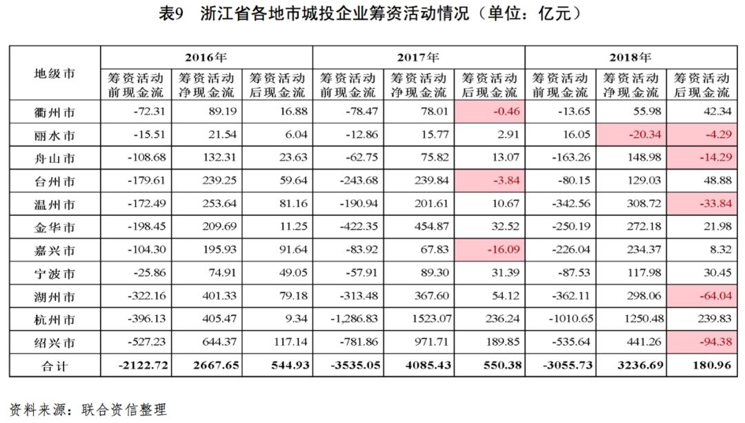 從籌資活動前凈現金流來看,2016—2018年,浙江省各地市城投企業籌資活動前現金流主要呈凈流出態勢,且凈流出規模波動中有所增長,2018年為3055.73億元。2018年,麗水市籌資活動前現金流呈凈流入態勢,但規模較小。