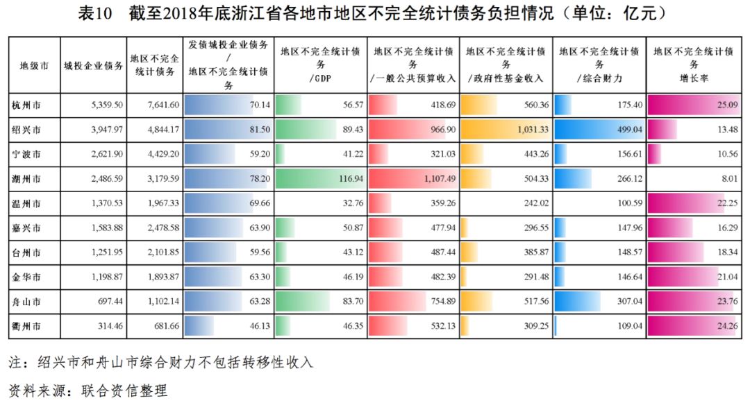 城投企業作為地方基礎設施尤其是公益性項目的投資建設主體,其自身造血能力不足,日常經營運轉以及債務償還對地方政府有很強的依賴。本文對浙江省城投企業債務風險分析,主要從地方政府對轄區內發債城投企業有息債務保障支持能力等方面展開分析。考慮到發債城投企業的有息債務在一定意義上為政府隱性債務,本文用地區不完全統計債務來衡量浙江省各地市債務水平。