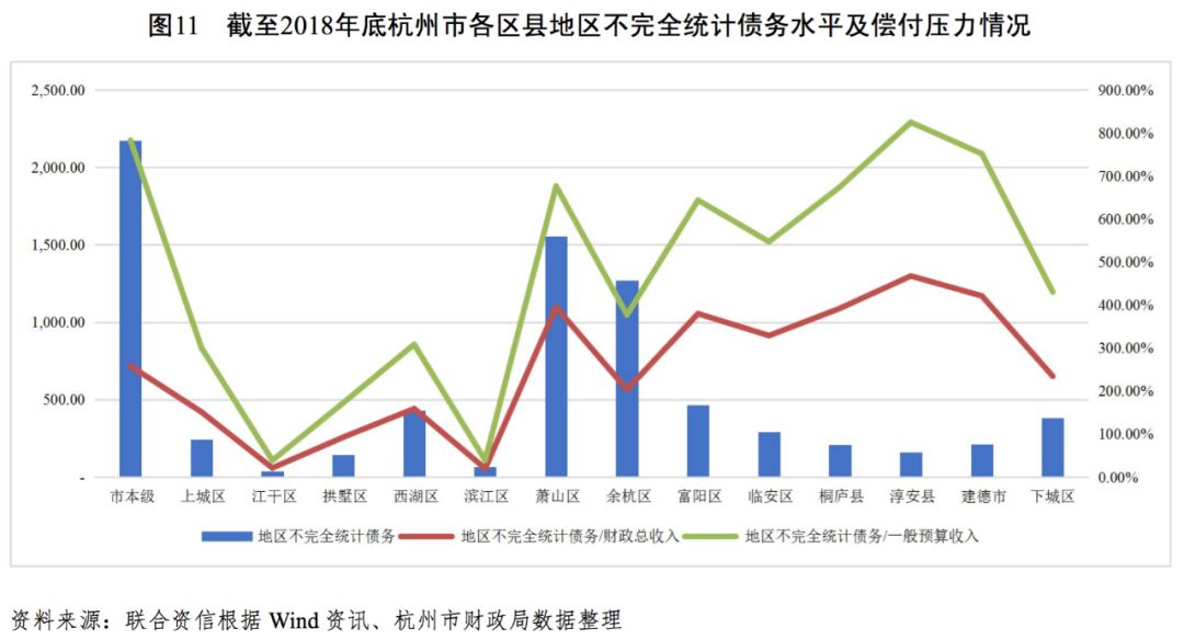 杭州市區縣級城投企業全部債務在浙江省內占比較高,蕭山區和余杭區城投企業全部債務在杭州市內占比較高,建德市和淳安縣地區不完全統計債務占財政總收入比很高。